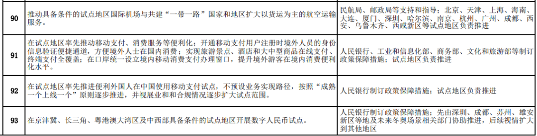 《全面深化服务贸易创新发展试点总体方案》在“全面深化服务贸易创新发展试点任务、具体举措及责任分工”部分提出:在京津冀、长三角、粤港澳大湾区及中西部具备条件的试点地区开展数字人民币试点。人民银行制订政策保障措施;先由深圳、成都、苏州、雄安新区等地及未来冬奥场景相关部门协助推进,后续视情扩大到其他地区。