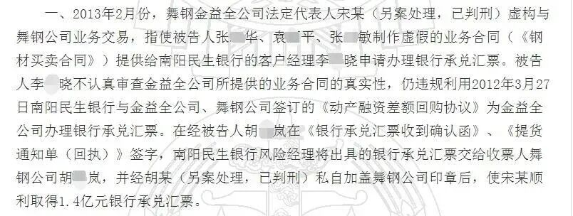 以宋某等人骗取民生南阳分行银行商业承兑汇票2.8亿元的案件为例,裁判文书显示:2013年2月份,宋某虚构金益全公司与舞钢公司业务交易,指使张某等3人制作虚假的《钢材买卖合同》,本案被告人之一、南阳民生银行的客户经理李某晓没有认真审查业务合同的真实性,仍违规利用2012年3月27日民生南阳分行、金益全公司、舞钢公司签订的《动产融资差额回购协议》,为金益全公司办理银行承兑汇票。后经他人的帮助,宋某顺利取得1.4亿元银行承兑汇票。