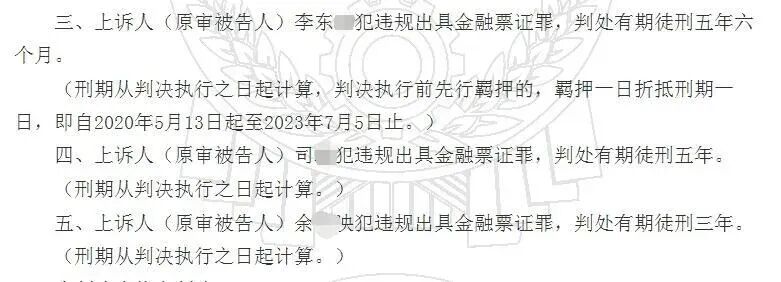 一审法院认为,本案中三名客户经理均构成违规出具金融票证罪,分别判处李某晓、司某、余某泱有期徒刑6年、5年半和5年。