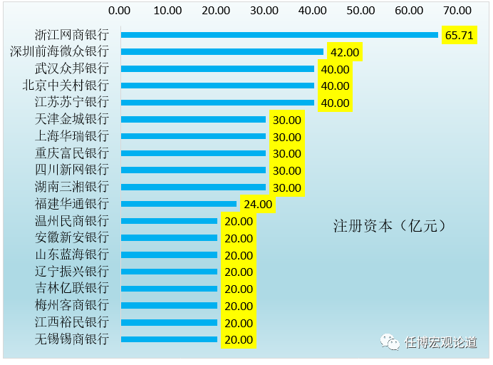 另外注册资本为30亿元的民营银行有5家,分别为天津金城银行、上海华瑞银行、重庆富民银行、四川新网银行、湖南三湘银行。福建华通银行的注册资本为24亿元,其余8家民营银行的注册资本均为20亿元。