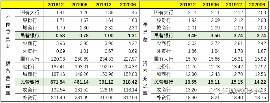 当然,不可否认的是,民营银行的不良贷款率绝对水平虽然有优势,但却呈现明显上升的特征。例如,2020年6月吉林亿联银行的不良贷款率已从1.21%上升至1.94%,另外不良贷款率上升较为明显或超过1%的民营银行主要有安徽新安银行(由0%升至1.66%)、微众银行(由0.51%升至1.24%)、辽宁振兴银行(1.15%)、天津金城银行(1.12%)、上海华瑞银行(由0.69%升至1.03%)、苏宁银行(由0%升至0.88%)。