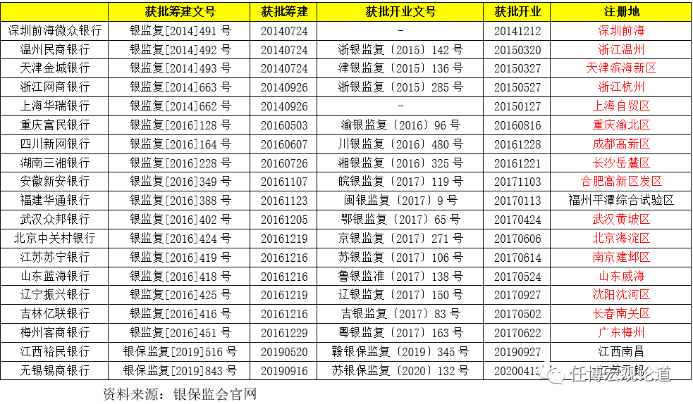 2020年1月3日,银保监会发布的《关于推动银行业和保险业高质量发展的指导意见》(银保监发〔2019〕52号)明确提出“继续推动符合条件的民营银行发起设立”。考虑到52号文剑指未来五年,因此后续还将有新的民营银行获批设立。