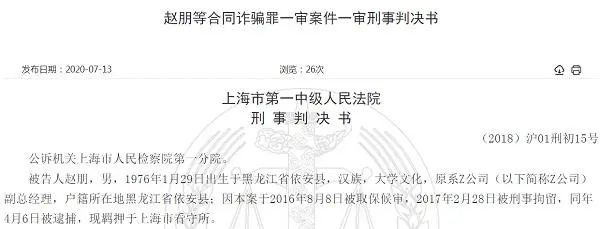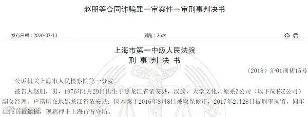 7月13日,上海市一中院公布一份刑事判决揭开了这起大案发生经过,主犯赵朋因犯贷款诈骗、合同诈骗等罪名,最终获刑19年入狱,一同被判决的还有其多名同伙。