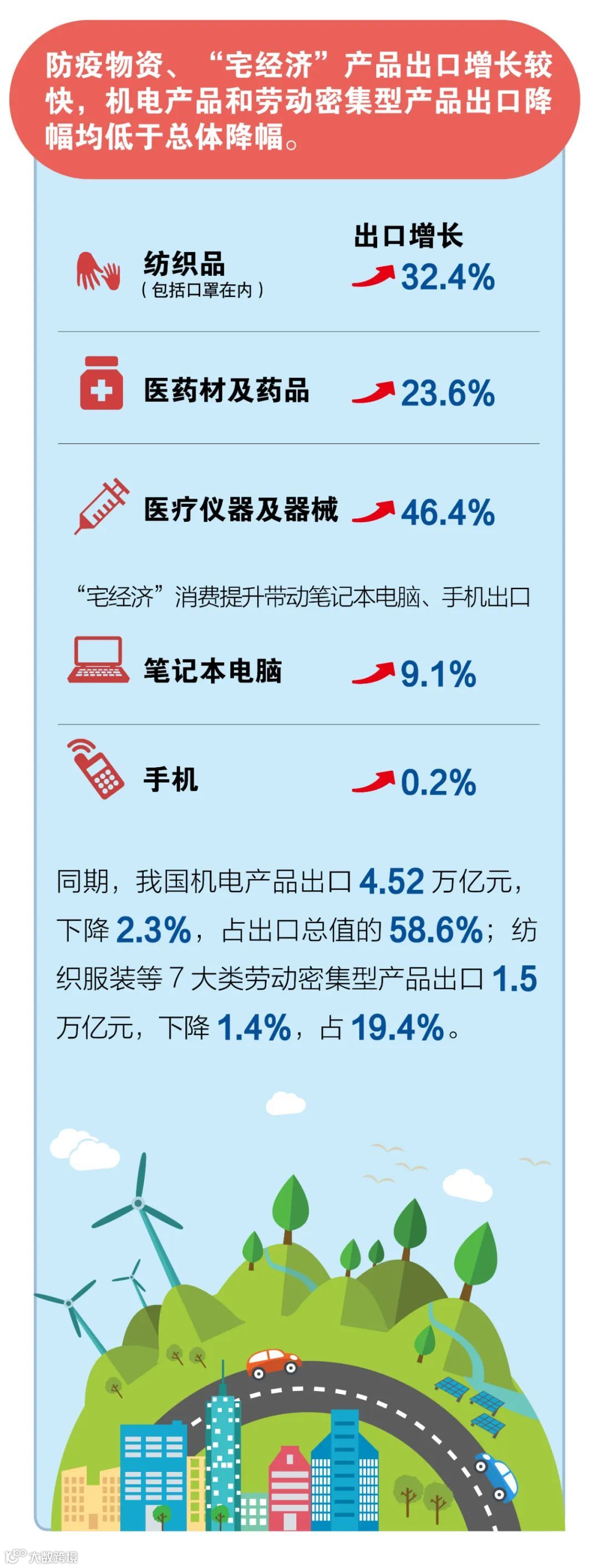 上半年,包括口罩在内的纺织品出口增长32.4%,医药材及药品、医疗仪器及器械出口分别增长23.6%、46.4%,“宅经济”消费提升带动笔记本电脑、手机出口分别增长9.1%、0.2%。同期,我国机电产品出口4.52万亿元,下降2.3%,占出口总值的58.6%;纺织服装等7大类劳动密集型产品出口1.5万亿元,下降1.4%,占比19.4%。