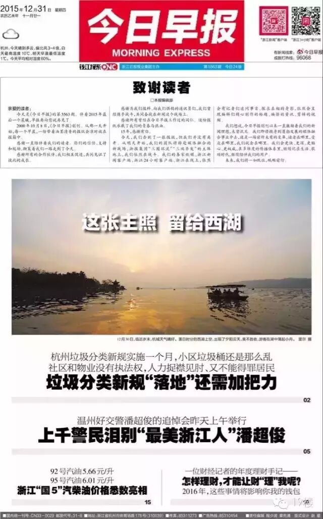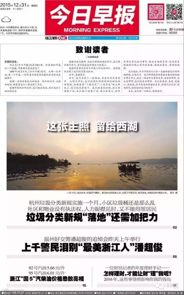 2015年的最后一天,继陪伴我们八年的《都市周报》停刊后,已创办十五年的《今日早报》也宣布停刊。