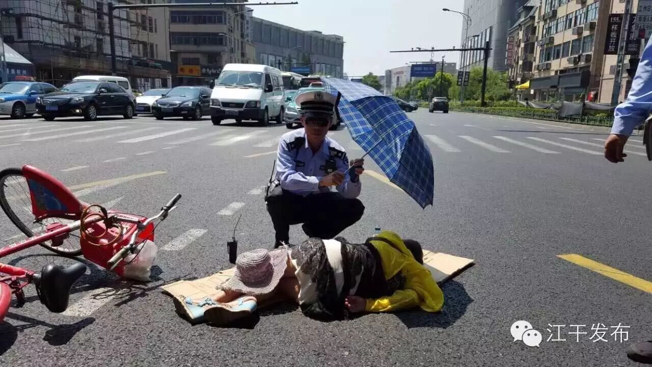 昨天下午13时30分许,黄晓东正在秋涛路解放东路口执勤,突然听到一声尖叫,顺着声音的方向看去,只见一个人摔倒在了路口。他立即跑上前,原来是一辆由南往西左转弯的小轿车撞上了由南往北直行的骑自行车的大姐。大姐被撞后一度处于半昏迷状态,由于地面温度非常高,黄晓东试图将大姐扶起来,但是大姐一直喊疼,因担心自己的搀扶会给伤者带来二次伤害,黄晓东还是决定等救护车。但是地面温度如此高,如果让伤者一直躺着,不烧伤也得中暑。黄晓东做了简易的现场防护后,立即就近取来纸板箱拆开,铺在伤者的身下。在伤者裸露在烈日下的腿部用帽子遮挡了起来。并给伤者打上遮阳伞,让伤者得到一点阴凉。于是就有了下面这张照片!