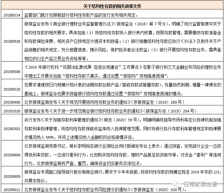 昨天(2020年6月12日),北京银保监局发布《关于结构性存款业务风险提示的通知》(京银保监发〔2020〕320号),对结构性存款业务从严控业务总量及增速(增长过快的银行要逐月压降)、确保产品设计审慎合规、加强资金来源甄别(防空转套利)、切实规范宣传销售行为等几个维度进行规范约束。
