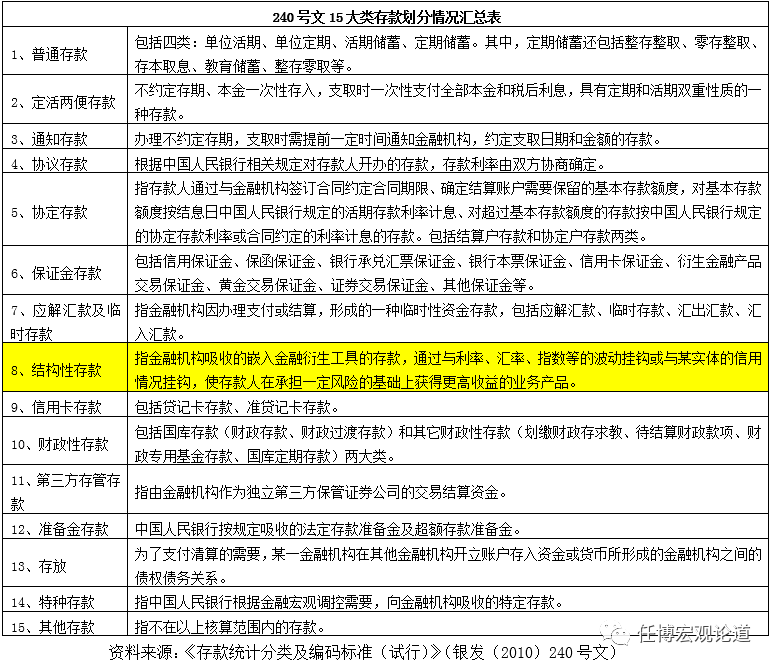 为进一步明晰结构性在整个存款类别中的地位,现将240号文中的存款细分类汇总如下,240号文将存款总共分为15大类。