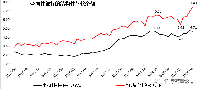 根据央行披露的数据,2020年4月,全国性银行的结构性存款余额高达创纪录的12.14万亿。其中,个人和企业分别达到创纪录的4.71万亿和7.43万亿。相较于2019年底,个人和企业结构性存款分别净增0.53万亿和2.01万亿,合计净增2.54万亿。可以看出企业结构性存款的净增额远远大于个人,背后折射的便是非常畸形的资金空转现象。