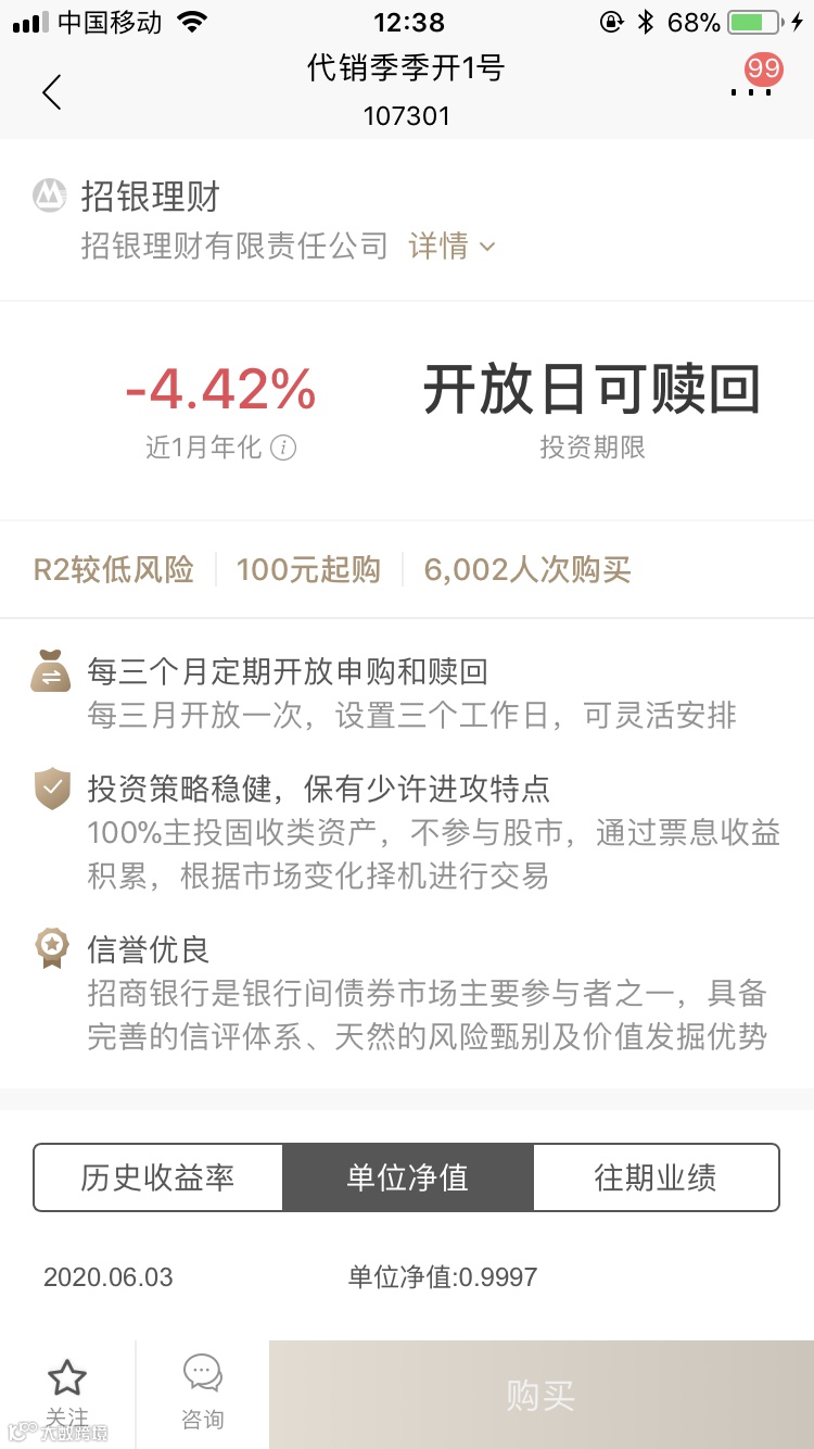 6月3日,招银理财“代销季季开1号”单位净值是0.9997,该产品5月初净值最高点还是1.0031。跌破成本价,近一个月的年化收益降为-4.42%。