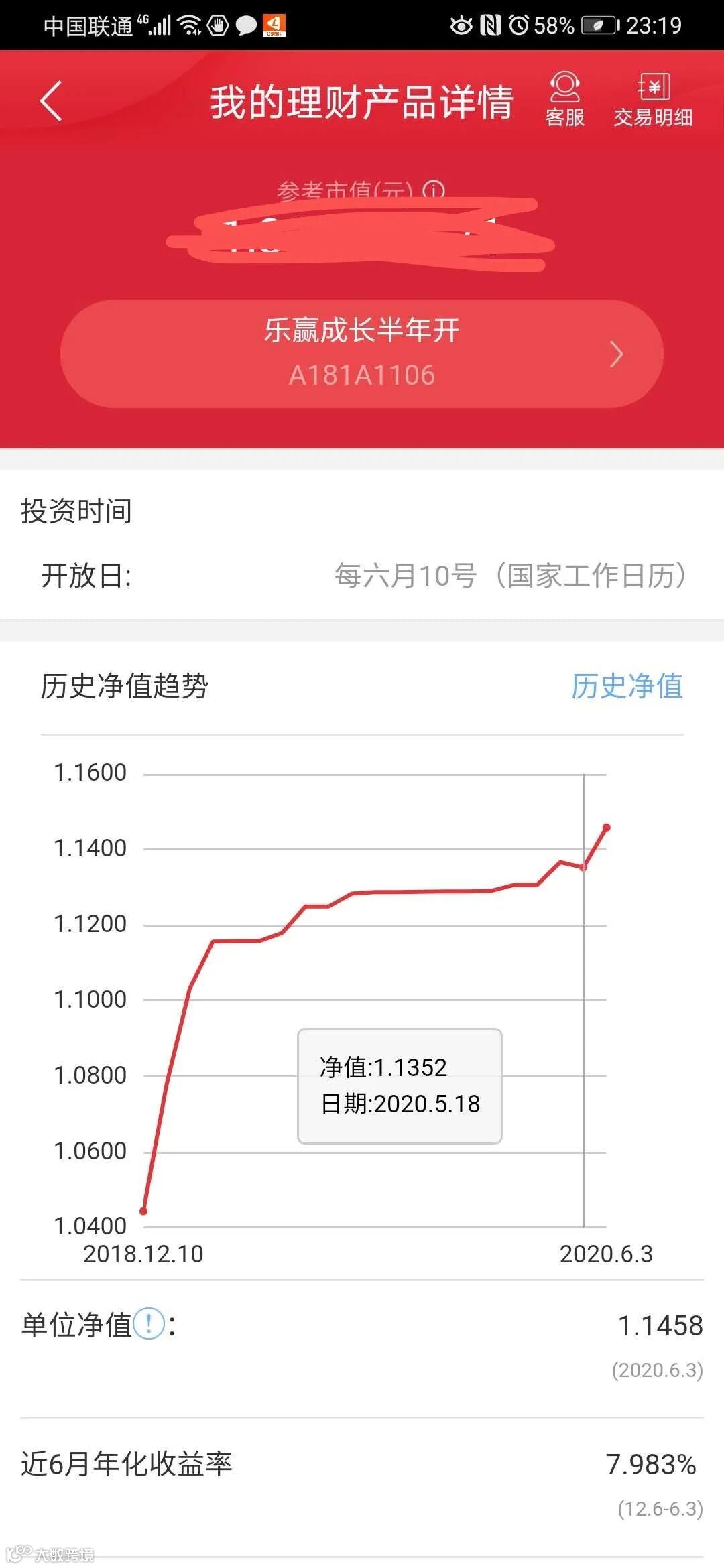 半年前,刘先生买了这款产品。6月9日晚,刘先生看了一眼银行APP,显示6月3日产品净值1.1458。
