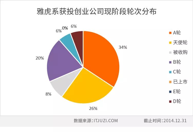 从领域分布上看,电子商务占了很大比例,而其他领域也分布广泛,涵盖旅游户外、金融服务、企业服务、SNS社交、工具软件、电子硬件等领域,2014年的途牛上市,也让大家看到阿里系的创业者并不是只在电子商务领域成绩不俗。从投资轮次分布上看,近一半获得投资的创业公司现在处于A轮阶段,达到B轮的也有11%,可以看出阿里系创业公司的融资进程在各大派系中是很快的。2014年阿里巴巴系公司中蜜淘网、堆糖网、星空琴行等完成了B轮融资。
