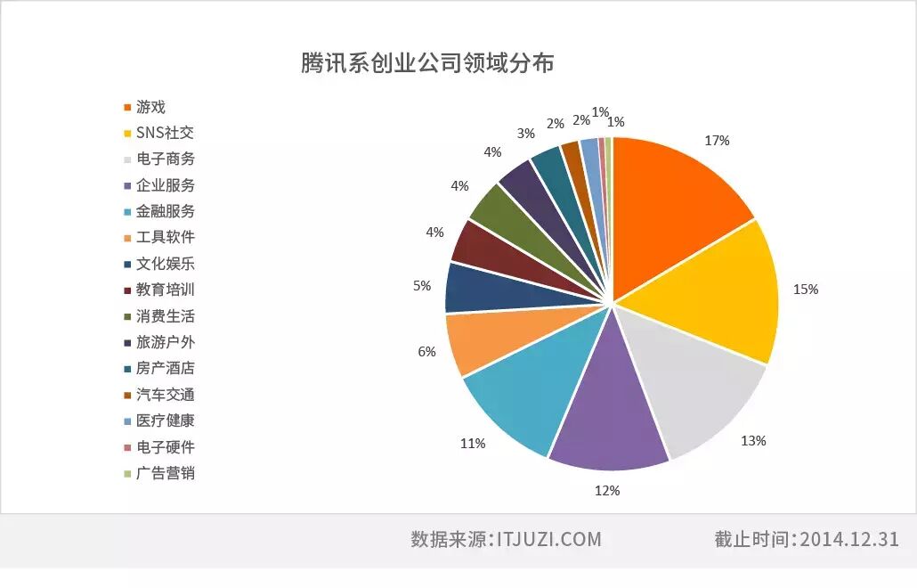 截止到2014年12月 31日,IT桔子数据库共收录创始人或创始团队成员来自腾讯的创业公司156家, 其中2014年创办的公司32家。