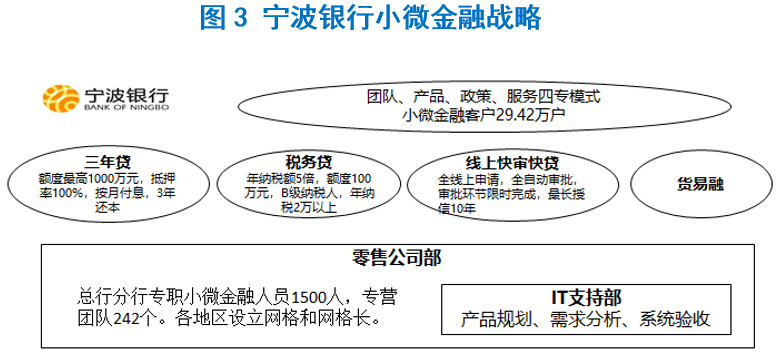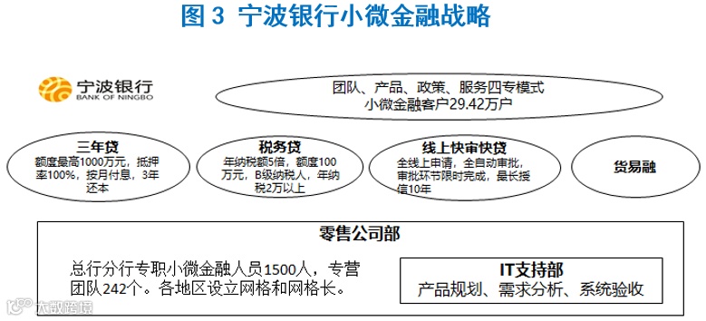 宁波银行对于小微金融客户的交叉营销、综合金融服务能力十分突出。他们设置了1500人的专职小微金融队伍——零售公司部,通过242个网格精细化管理小微金融业务。零售公司部有小微金融团队专属的IT支持部,可以快速地响应业务的需求,这点相对其他银行有较大的优势。