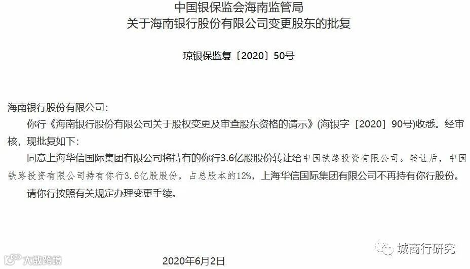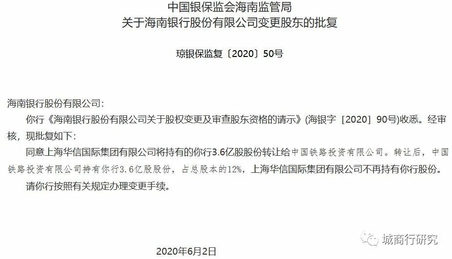 批复显示,海南银保监局根据相关规定,同意上海华信国际集团持有的海南银行3.6亿股转让给中国铁路投资公司。
