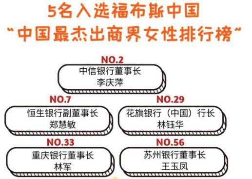 她们巾帼不让须眉。在今年福布斯中国推出的 “中国最杰出商界女性排行榜”中,就有5名银行女高管入选。