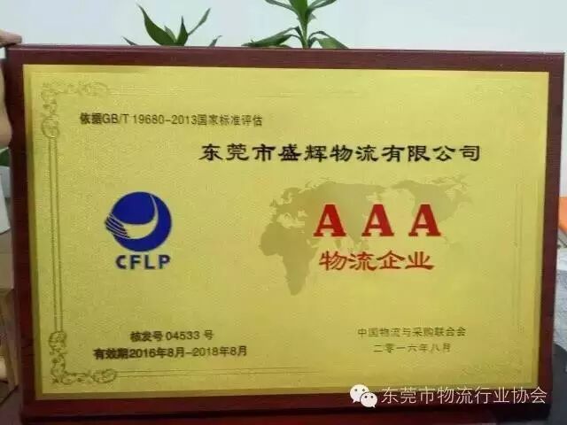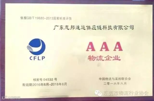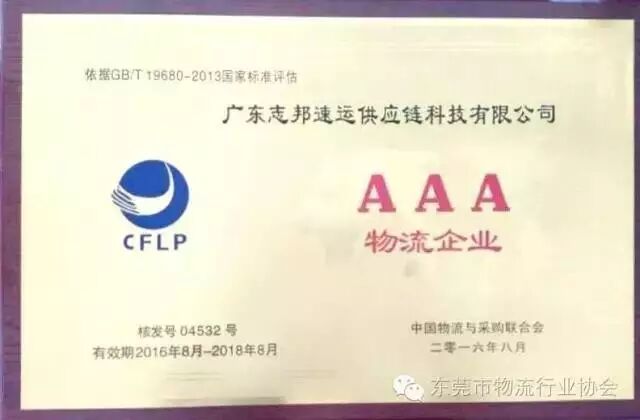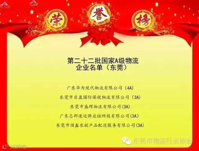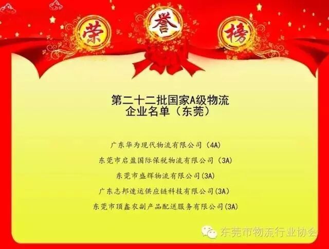 近日,中国物流与采购联合会公示了第二十二批A级物流企业名单,东莞市新增A级物流企业5家,其中4A级有1家(广东华为现代物流有限公司),3A级有4家(东莞市启盈国际保税物流有限公司、东莞市顶鑫农副产品配送服务有限公司、广东志邦速运供应链科技有限公司、东莞市盛辉物流有限公司),并由中国物流与采购联合会颁发了A级牌匾以及A级证书。