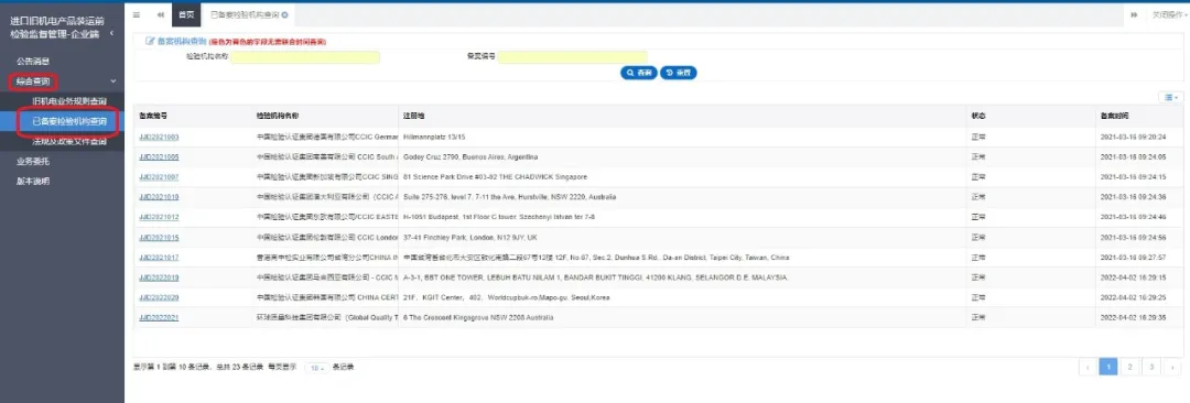 答:“中国国际贸易单一窗口”——标准版应用(口岸执法申报)——检验检疫——进口旧机电产品装运前检验监督管理系统——委托企业入口——综合查询——已备案检验机构查询模块。