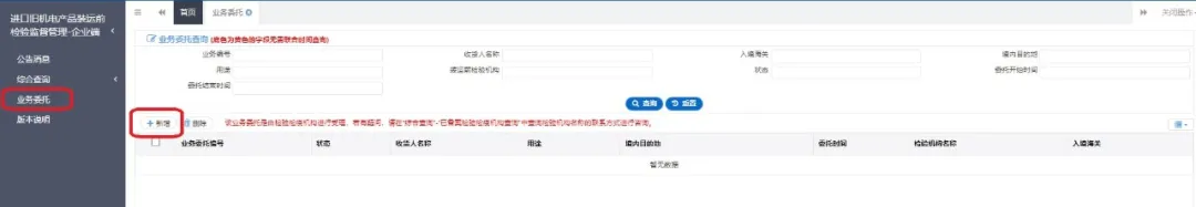 答:“中国国际贸易单一窗口”-标准版应用-检验检疫-进口旧机电产品装运前检验监督管理-委托企业入口-业务管理-业务委托,点击“新增”按钮,进入“新增业务委托界面”,其中必填项以红色*标出。可编辑字段为黄色底框,用户可以填写或者修改。不可编辑字段为灰色底框。如总数量、总金额为灰色不可编辑,该数据会自动从货物详情信息的数量和金额进行合计算出。填写完毕货物信息后,点击申请材料,上传相关随附单据。点击提交,由机构端进行审核。若机构端接受委托,则在业务委托列表的状态中显示“受理中”,检验机构继续添加随附单据、输入检验机构证书编号、证书有效期提交后业务委托列表的状态显示检验完成。若机构端退回委托,则在业务委托列表的状态中显示“补充材料”,企业根据要求修改补充材料再次提交由检验机构审核。