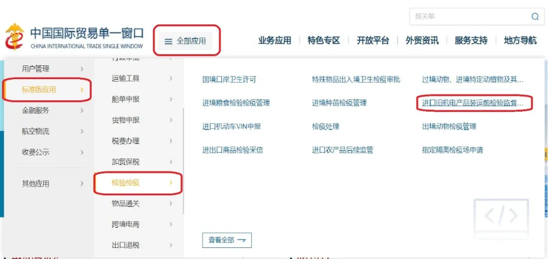通过“中国国际贸易单一窗口”——标准版应用(口岸执法申报)——检验检疫——进口旧机电产品装运前检验监督管理系统——委托企业入口——综合查询——旧机电业务规则查询模块,输入产品的HS编码,即可知晓相关商品是否需要装运前检验。