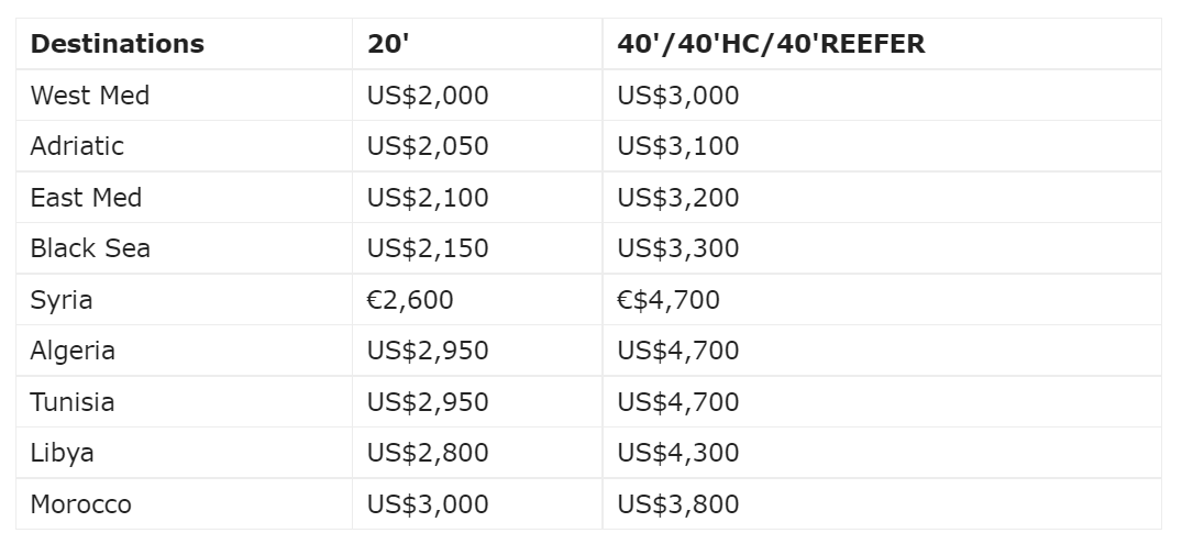 MSC亚洲至西地中海、亚得里亚海、东地中海和黑海FAK新标准