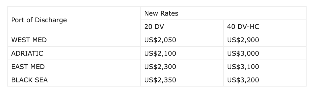 以星也从2023年12月13日起,上调从亚洲到地中海和黑海地区的FAK。