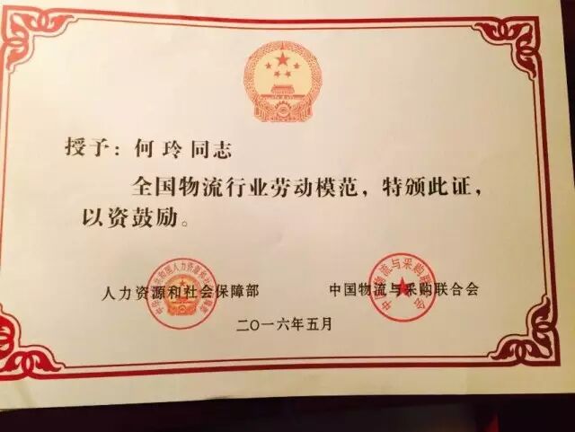 购联合会共同举办的全国物流行业劳动模范表彰大会在北京隆重举行。 董事长何玲 因为其长期以来始终以一种强烈的责任感和使命感,大胆开拓,勇于创新,使企业成为行业高速发展的领头人,在深入贯彻落实科学发展观,与时俱进,开拓创新,为推动我国物流业的发展作出的积极贡献,在本次表彰中荣获“全国物流行业劳动模范”称号,享受省部级劳动模范待遇。