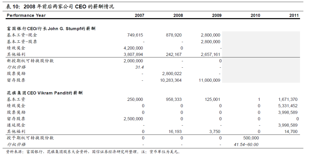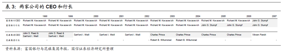 在2008~2009年期间,两家公司的CEO都与2007年是同一人,且两人都是2007年上任(富国银行CEO兼任行长,花旗集团则不设行长一职)。