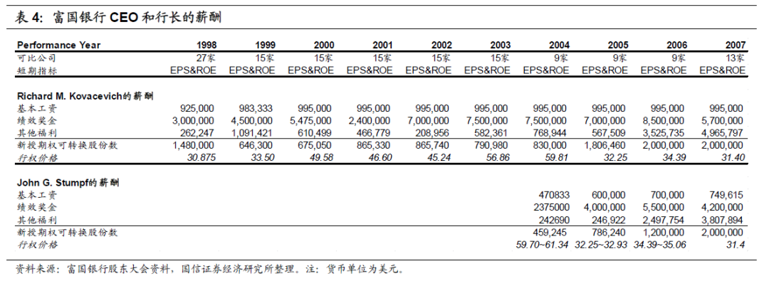 绩效奖金:董事会在年初设定短期指标(EPS和ROE),公司完成其中一个指标时即可发放奖金,否则不发放。奖金的具体数额根据富国银行相对可比公司的历史表现、业务条线任务完成情况(仅针对业务条线领导)、个人定性评价等制定,但不能超过事前规定的上限。富国银行的绩效奖金基本都是现金。