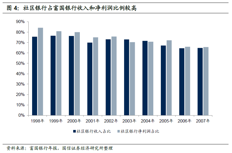 在样本区间内,富国银行按客群将其业务划分为三大块:社区银行、批发银行和富国金融(2001年之前住房按揭业务单列,之后则并入社区银行,因此我们将2001年之前的住房按揭业务也调整到社区银行中)。其中社区银行主要为个人客户和小微企业提供金融服务,批发银行服务大中型对公客户,富国金融则主要向个人提供消费贷款业务。