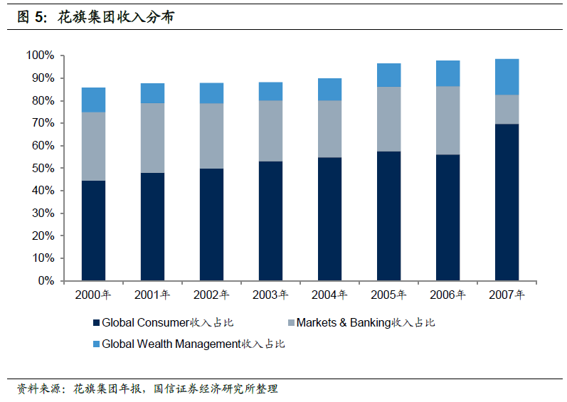 花旗集团的分部信息只能回溯到2000年。其主要业务板块名称在样本区间内几经变化,但主要内容没有发生太大调整。后面我们在提到业务板块时,均按2007年最新名称划分。