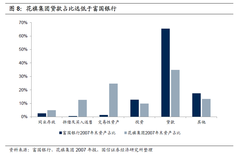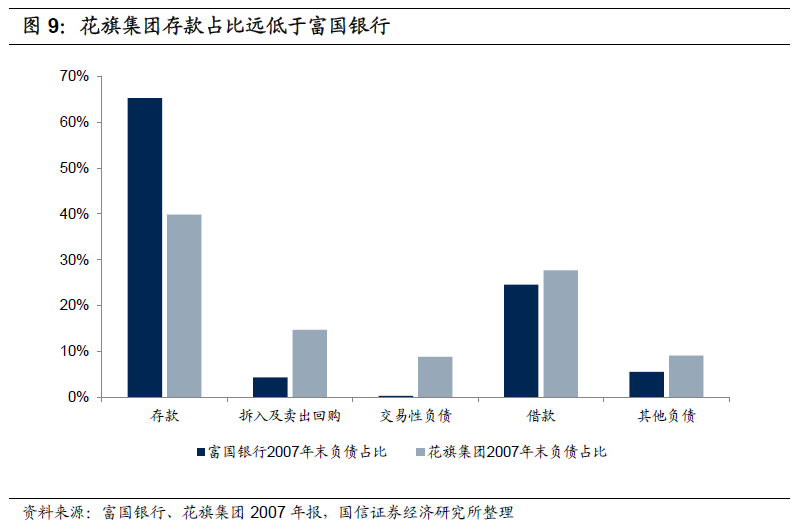 产品方面,富国银行是传统的商业银行,花旗集团混业程度更高,这符合各自定位的客户群体的金融服务需求。比如从非息收入来看,富国银行最大的非息收入来自账户服务费、受托业务、按揭业务等传统商业银行业务,而花旗集团的投资银行、交易价差等非息收入相对更多。混业经营给花旗集团带来更多的非息收入,在杜邦分析中也有体现。混业程度在资产负债表中体现地也非常明显:2007年末富国银行贷款占总资产的66%,而花旗集团仅占35%;富国银行存款占负债的65%,而花旗集团仅占40%。