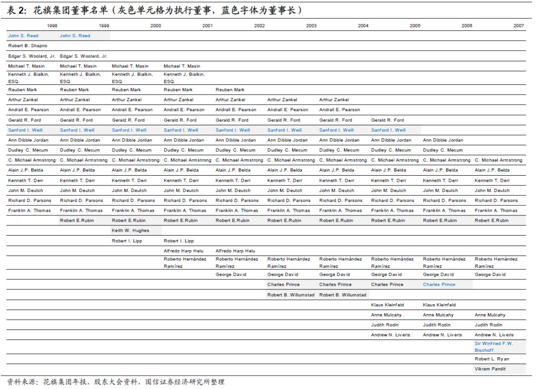 花旗集团大部分时间不设行长,只不过CEO变动相对频繁。花旗集团在1998-2007年期间,绝大部分时间都没有行长,仅在2003-2004年短暂设置过行长一职(时任行长Robert B. Willumstad后因竞选CEO失败而离任)。其在1998-2007年之间经历了四任CEO:1998-1999年由John S. Reed和Sanford I. Weill联合担任,2000-2002年由Sanford I. Weill担任,2003-2006年由Charles Prince担任,2007年由Vikram Pandit担任。