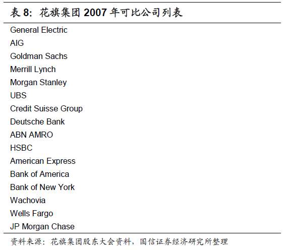 最后,从可比公司列表来看,花旗集团与富国银行有明显差别。作为一家国际性银行,花旗集团的可比公司中有多家国外金融机构(如HSBC等);由于花旗集团混业程度高(我们将在下文中予以展示),其可比公司中也有很多非商业银行机构(如Goldman Sachs等)。