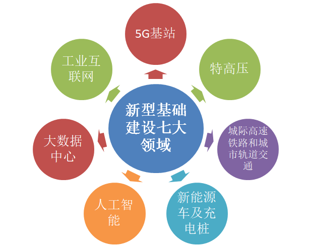 传统基础设施主要包括铁路、公路、机场、桥梁等,区别于传统基建,新基建着力的新范畴和领域在历次会议中已基本被明确,主要可归为“高技术”和“补短板”两类,其特点在于支持科技创新、智能制造的相关基础设施建以及针对“旧基建”进行的补短板工程。主要发力于科技端,具体来看包括5G基建、特高压、城际高速铁路和轨道交通、新能源充电桩 、大数据中心、人工智能、工业互联网等七大产业方向。与传统基础设施建设不同,包括工业互联网在内的“新基建”突破了“铁公基”和房地产为代表的模式,具有数字化、网络化、智能化特征。