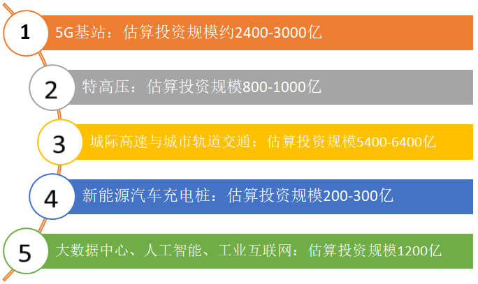 根据广发证券对央视口径七大新基建的投资规模做一个粗略估算我们可以看出新基建无论是 “狭义新基建”(5G基站、人工智能和工业互联网、大数据中心等)、“广义新基建”(特高压、充电桩、城际高速和轨道交通等)七大领域新基建的年内投资规模可能大约1.1万亿左右(大约占去年基建投资总额6%),不含城际高速和城市轨道交通大约5400-6400亿。当然,这只是一个关于“量级”的粗略估算,且只是依据特定口径,未必能涵盖所有新基建领域。