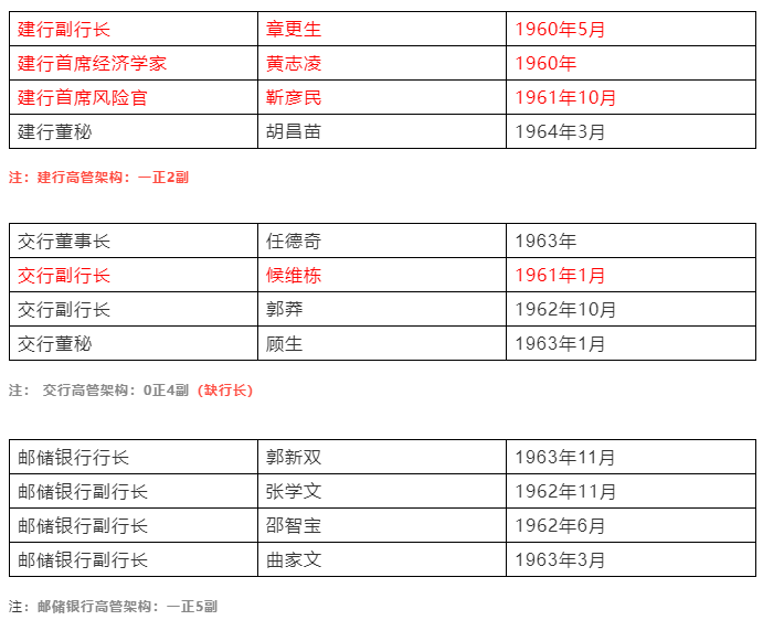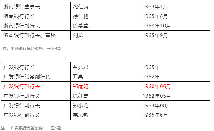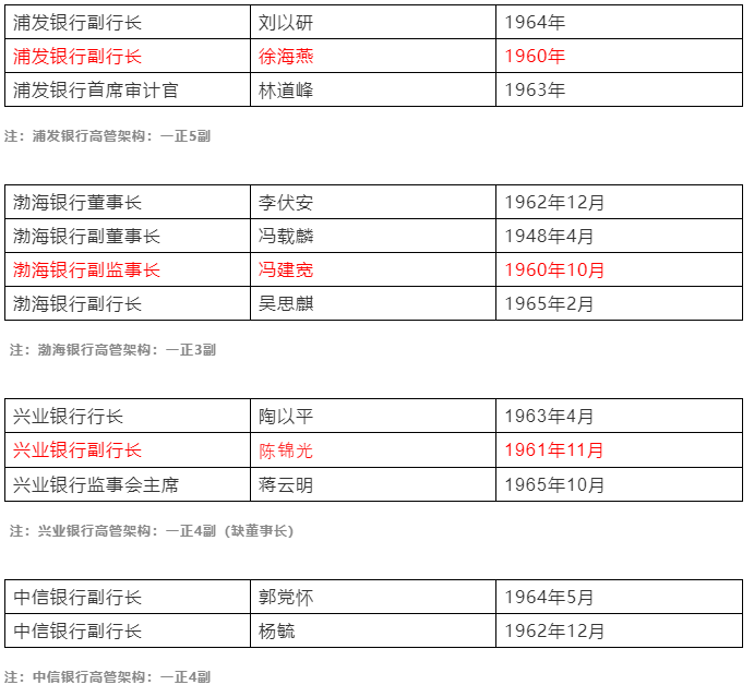 平安银行目前仅有两位副行长,该行监事长邱伟和行长胡跃飞都已58岁。另外可以看到,广发银行副行长郑廉明(1960年)和浦发银行徐海燕(1960年)今年也将迎来退休年龄。