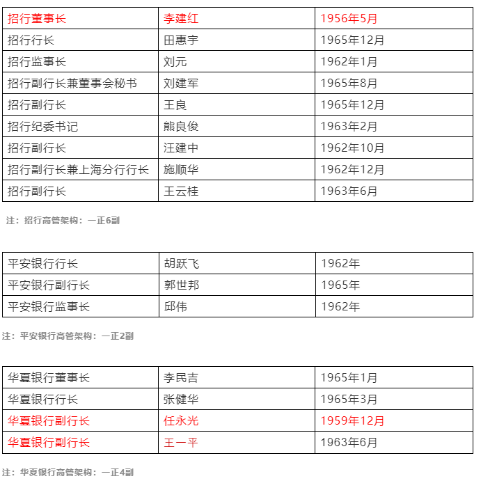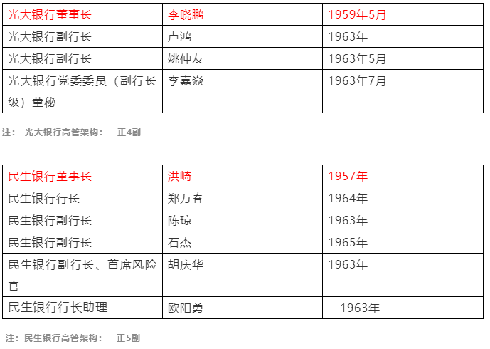 民生银行行长郑万春(1964年)以及5位副行长中的3位都是1965年前生人,分别为陈琼(1963年)、石杰(1965年)、胡庆华(1963年),另外两位副行长为李彬(1967年)、林云山 (1970年),另外民生银行纪委书记陈进忠出生于1960年,今年也迎来退休年龄。
