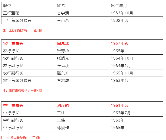 农行董事长周慕冰出生于1957年9月,由于国有大行董事长一般是63岁退休,周慕冰今年9月也将迎来退休年龄,行长张青松还有三位副行长是65前生人。