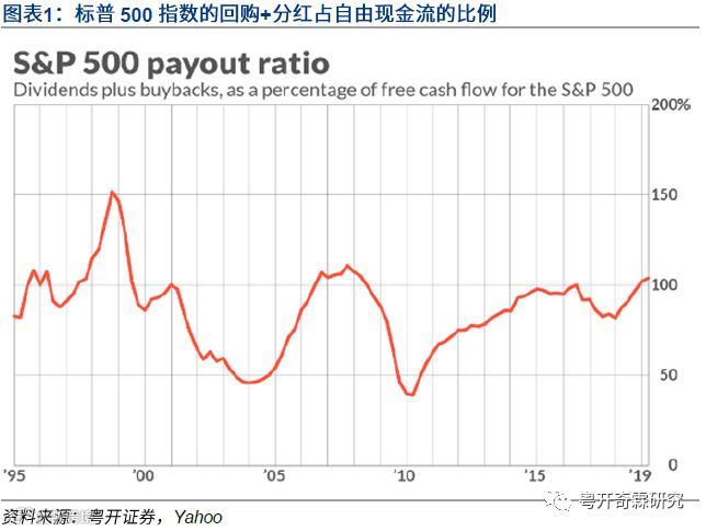 我们先来看一张图,这是美国标普500指数的上市公司在1995-2019年期间,股票分红+回购占企业自由现金流的比例,可以看到在2019年,这一比例已经超过了100%。这意味着,美国上市公司的自由现金流规模不足以支撑他们的回购和分红需要,他们还需要借债,用筹资性现金流。