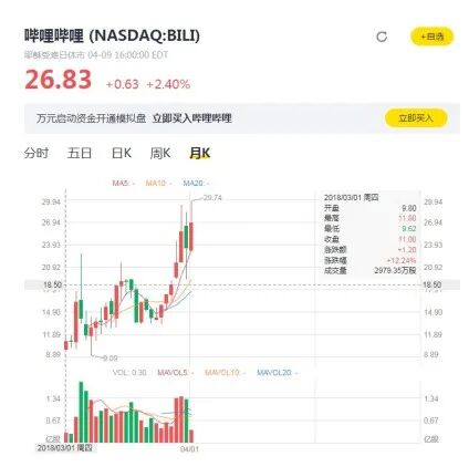 9日哔哩哔哩在纳斯达克收于26.83美元,距离2018年3月上市价9.8美元,涨幅显著。