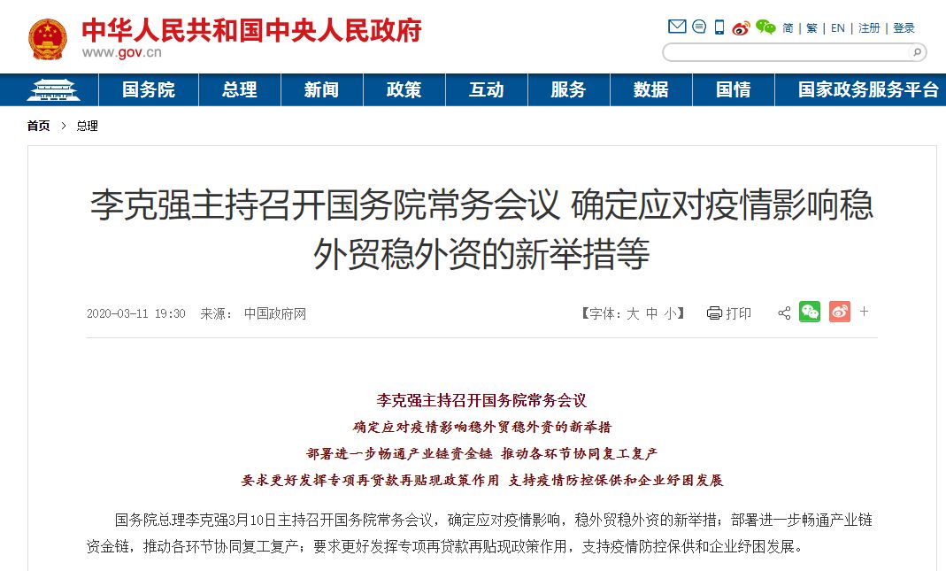 国务院总理李克强3月10日主持召开国务院常务会议,确定应对疫情影响,稳外贸稳外资的新举措;部署进一步畅通产业链资金链,推动各环节协同复工复产;要求更好发挥专项再贷款再贴现政策作用,支持疫情防控保供和企业纾困发展。