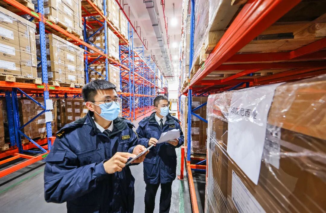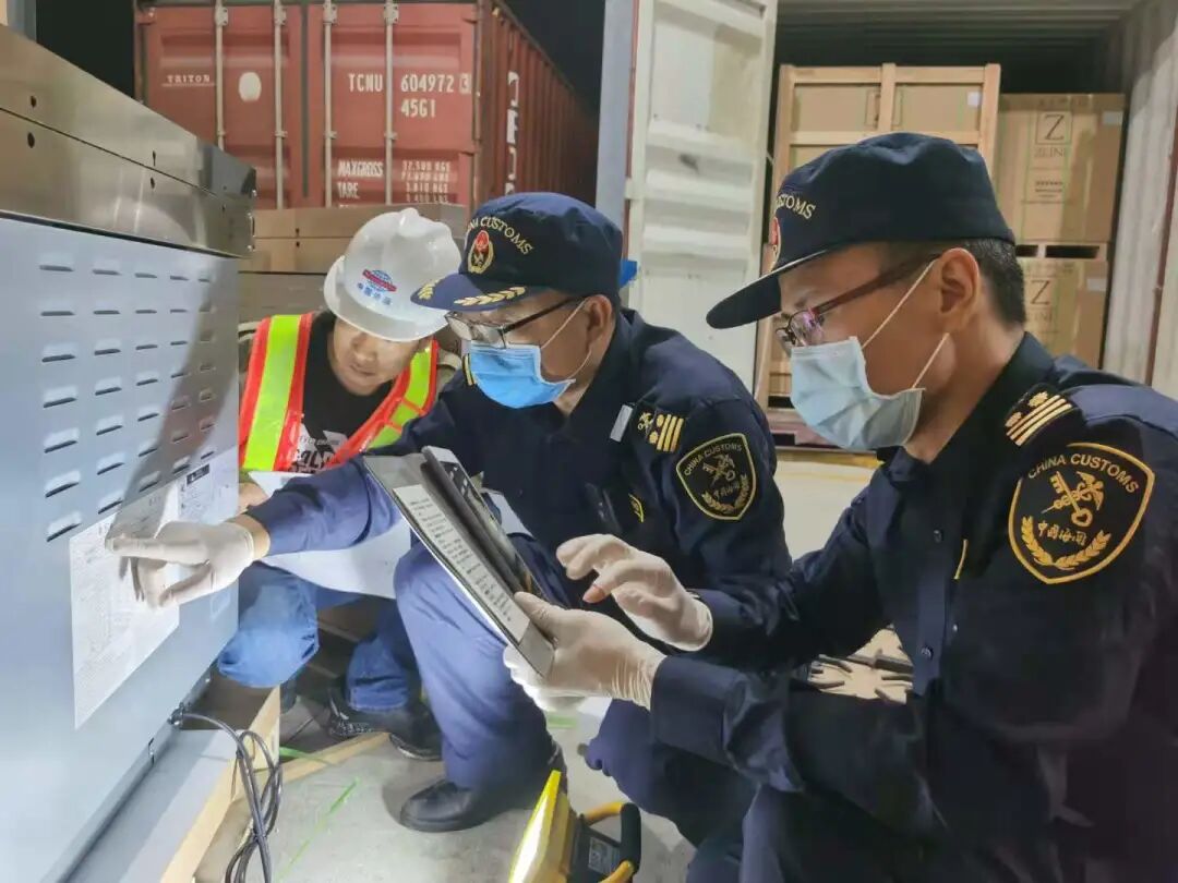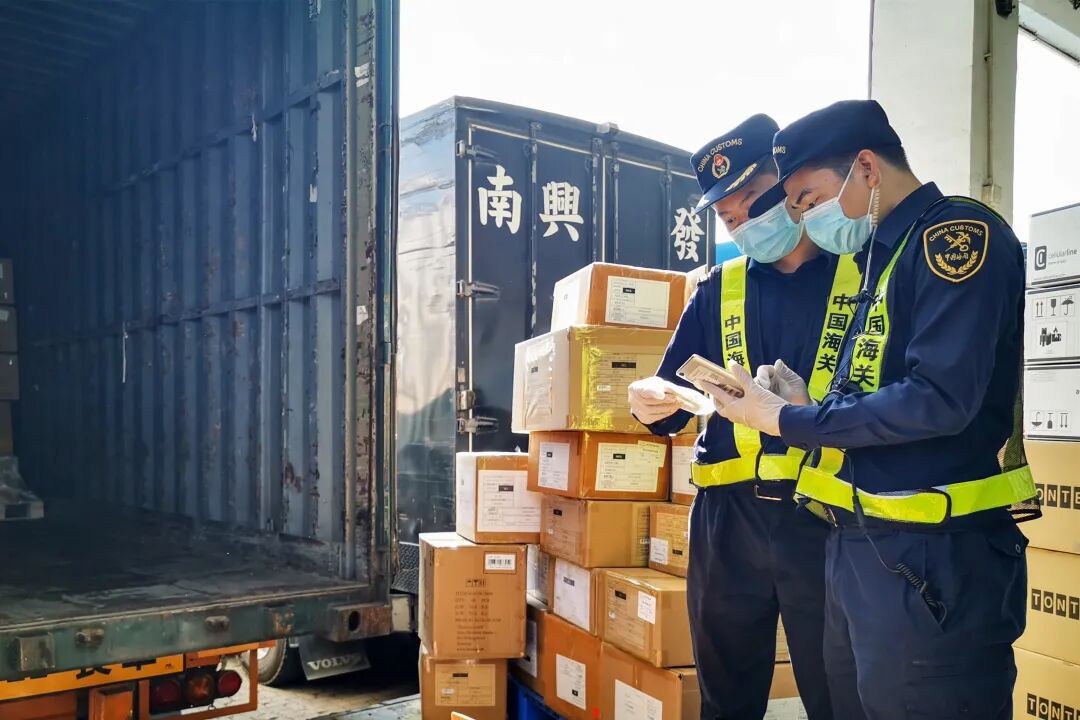 10点05分,江门海关所属外海海关关员李计升(右一)、刘一波(右二)对来自东盟的货物进行查验。