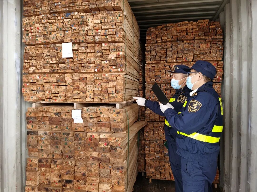 14点07分 上海外高桥港区海关关员高振鑫(左)肖兰波(右)在上海外高桥港区海关浦东物流查验场站对一批来自东盟的橡胶木板材实施查验施查验。