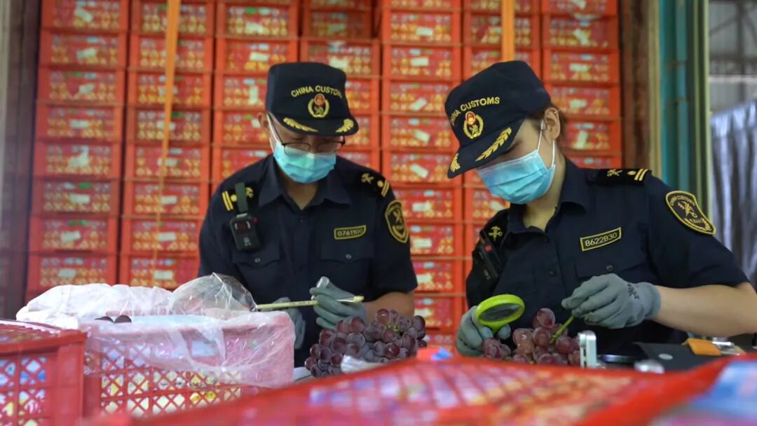 10点,昆明海关所属勐腊海关关员李春苇(左)、张雪婷(右)在中老磨憨口岸进口货物查验区对东盟进口鲜葡萄进行查验。