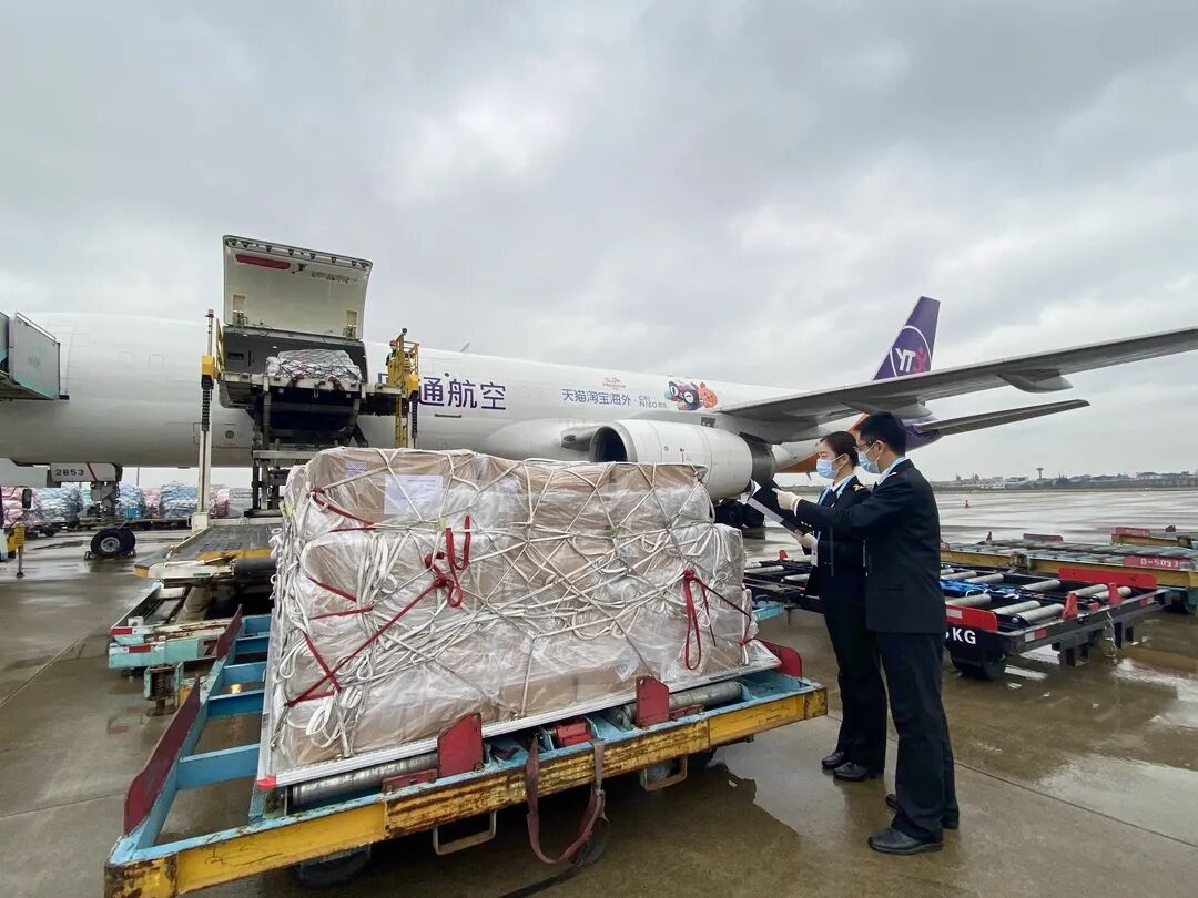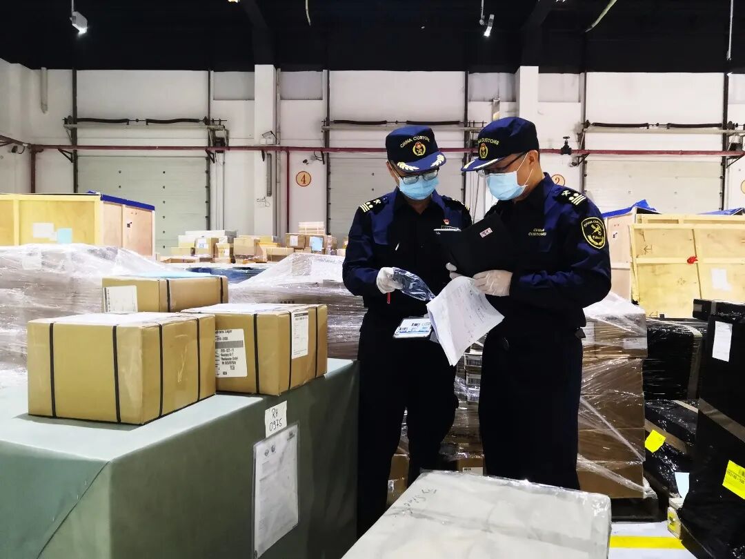 11点37分,杭州海关所属杭州萧山机场海关关员高祎(左)、吴尖子(右)在空港口岸监管一批即将出口东盟的跨境电商货物。