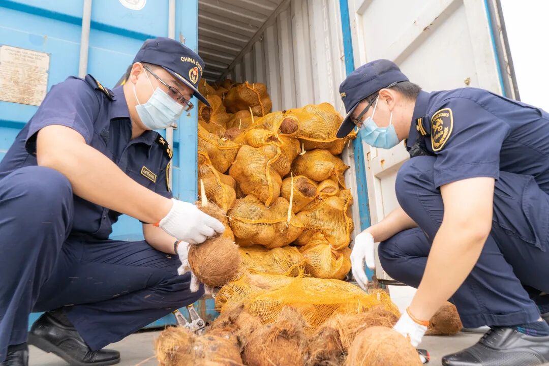 10点40分,海口海关所属洋浦港海关监管一科关员刘子君(左)、高帅(右)在小铲滩查验场对东盟进口椰子进行查验。