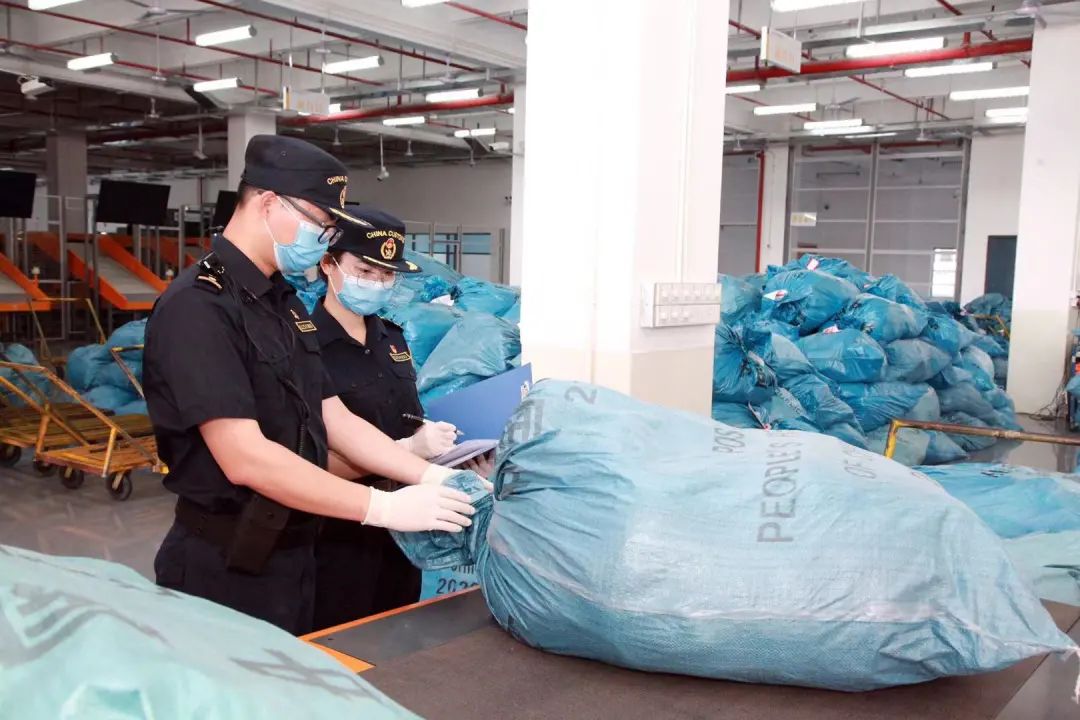 10点12分,黄埔海关所属东莞海关关员罗建宏(左)、邹毅(右)在东莞国际邮件互换局验放发往东盟国家的邮件。