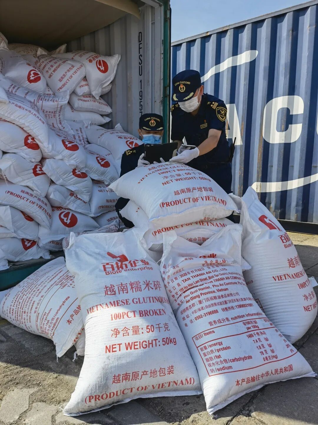 11点40分,东渡海关关员韩志国(左)和邱继军(右)正在对一批东盟进口糯米实施查验。