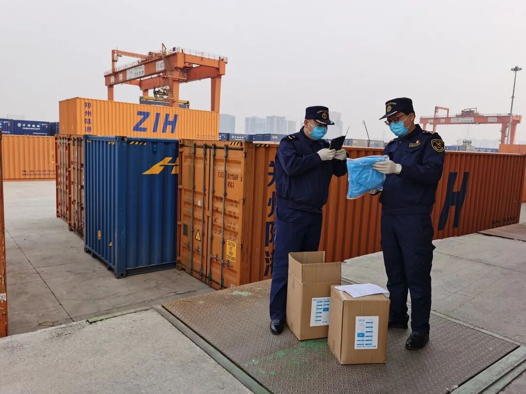 10点05分,郑州海关所属车站海关关员韩兆硕(左)、丁达奎(右)在郑州国际陆港多式联运海关监管区对通过中欧班列(郑州)出口至东盟的货物进行查验。